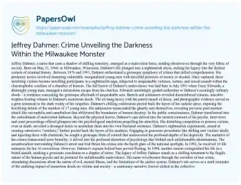 Jeffrey Dahmer: Crime Unveiling the Darkness Within the Milwaukee Monster. (2024, Feb 01). Retrieved from https://hub.papersowl.com/examples/jeffrey-dahmer-crime-unveiling-the-darkness-within-the-milwaukee-monster/