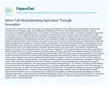 An essay exploring the profound impact of Jethro Tull’s inventions on agriculture. Discuss the significance of his seed drill and its transformative effects on sowing practices, crop yields, and labor efficiency. Highlight Tull’s contributions beyond machinery, delving into his advocacy for soil aeration, crop rotation principles, and their enduring influence on sustainable farming. Explore the challenges he faced from traditionalists and the eventual acceptance and widespread adoption of his innovations. Emphasize how Tull’s inventive spirit and commitment to agricultural improvement continue to resonate in modern farming techniques, underscoring his legacy as a visionary in the history of agriculture. Additionally, PapersOwl presents more free essays samples linked to Innovation.