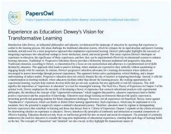 Experience as Education: Dewey's Vision for Transformative Learning. (2019, Feb 22). Retrieved from https://hub.papersowl.com/examples/john-dewey-characterizes-traditional-education/