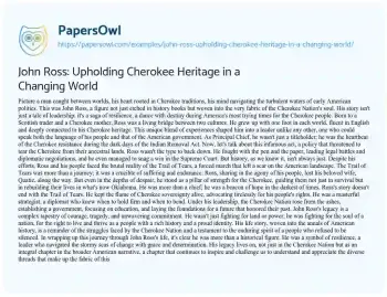 This essay paints a vivid portrait of John Ross, a central figure in Cherokee history and an emblem of resilience against American expansionism. It delves into Ross’s unique background, a fusion of Cherokee and Scottish heritage, which positioned him as a bridge between two cultures. As Principal Chief of the Cherokee Nation, his leadership during the tumultuous era of the Indian Removal Act is explored in depth. The essay vividly recounts Ross’s tireless efforts in legal battles and negotiations to safeguard Cherokee lands, culminating in the tragic Trail of Tears. Despite this heartbreaking event, Ross’s unwavering spirit in guiding his people through suffering and rebuilding their community in Oklahoma is highlighted. The piece portrays Ross not just as a political leader but as a beacon of hope and symbol of the Cherokee Nation’s enduring strength. His legacy is presented as a complex tapestry of courage, tragedy, and commitment, reminding us of the struggles of the Cherokee people and their unbreakable spirit. This essay offers a compelling look at Ross’s life, underscoring his significant role in American history and the ongoing narrative of the Cherokee Nation. PapersOwl offers a variety of free essay examples on the topic of Heritage