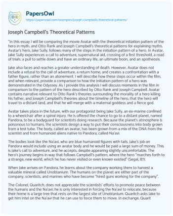 "In this essay I will be comparing the movie Avatar with the theoretical initiation pattern of the hero in myth, and Otto Rank and Joseph Campbell’s theoretical patterns for explaining myths. Avatar’s hero, Jake Sully, follows many of the steps in the initiation pattern of a hero. In Avatar, Jake Sully experiences a call to adventure, supernatural aid, crossing of a first threshold, a road of trials, a pull to settle down and have an ordinary life, an ultimate boon, and an apotheosis.