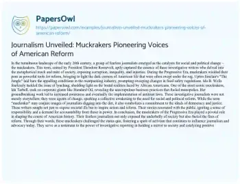 Explore the transformative era of American journalism with “Journalism Unveiled: Pioneering Voices of American Reform.” This essay delves into the Progressive Era, where fearless muckrakers wielded their pens as powerful instruments for societal change. From Upton Sinclair’s exposé on the meatpacking industry to Ida Tarbell’s revelations about corporate giants like Standard Oil, these journalists courageously delved into societal muck and mire, sparking a collective awakening to the need for reform. Discover how their impactful storytelling not only exposed corruption and injustice but also catalyzed a spirit of activism, leaving an indelible mark on the trajectory of American journalism and advocacy. Moreover, at PapersOwl, there are additional free essay samples connected to Journalism.