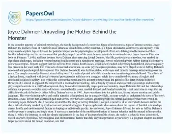 This essay delves into the life of Joyce Dahmer, mother of Jeffrey Dahmer, one of America’s most notorious serial killers, offering an insightful analysis of her potential impact on her son’s psychological development. It explores the complexities of Joyce’s life, marked by mental health issues, a troubled marriage, and the challenges of raising Jeffrey. The piece examines the family dynamics and maternal relationship within the Dahmer household, highlighting how these factors might have contributed to Jeffrey’s emotional and psychological state. The essay also addresses the broader implications of familial relationships, mental health, and environmental factors in shaping individual behavior, cautioning against oversimplified interpretations of such a complex situation. In shedding light on Joyce Dahmer’s story, the essay emphasizes the multifaceted nature of human behavior and the intricate web of influences that shape our lives, providing a nuanced perspective on the tragic narrative of the Dahmer family. PapersOwl showcases more free essays that are examples of Monster.