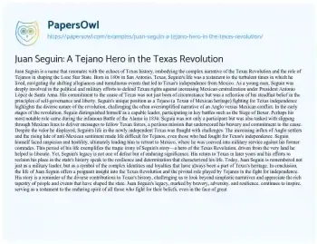 Juan Seguin: A Tejano Hero in the Texas Revolution. (2024, Feb 20). Retrieved from https://hub.papersowl.com/examples/juan-seguin-a-tejano-hero-in-the-texas-revolution/