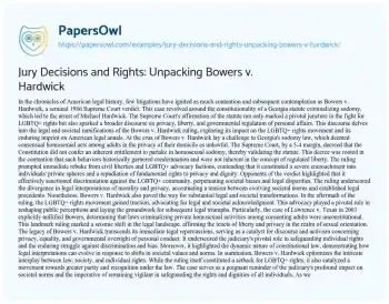 This essay about the landmark case of Bowers v. Hardwick explores its impact on LGBTQ+ rights and the broader discourse on privacy, liberty, and governmental regulation. The Supreme Court’s ruling upheld Georgia’s sodomy law, sparking backlash and highlighting the tension between evolving societal norms and established legal precedents. Despite being a setback, the case paved the way for significant legal and societal transformations, ultimately contributing to the advancement of equality and recognition under the law. At PapersOwl, you’ll also come across free essay samples that pertain to Jury.