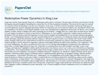 In "King Lear," forgiveness is a recurring theme that is both redemptive and tragic. Lopez’s essay “Trespass and Forgiveness” highlights Cordelia's and the French army's intervention to restore Lear’s status, yet it overlooks the true beginning of transgression—Lear's harsh treatment of Cordelia. Despite being wronged, Cordelia returns to aid Lear, showcasing an altruism that contrasts with the play's pervasive selfishness.