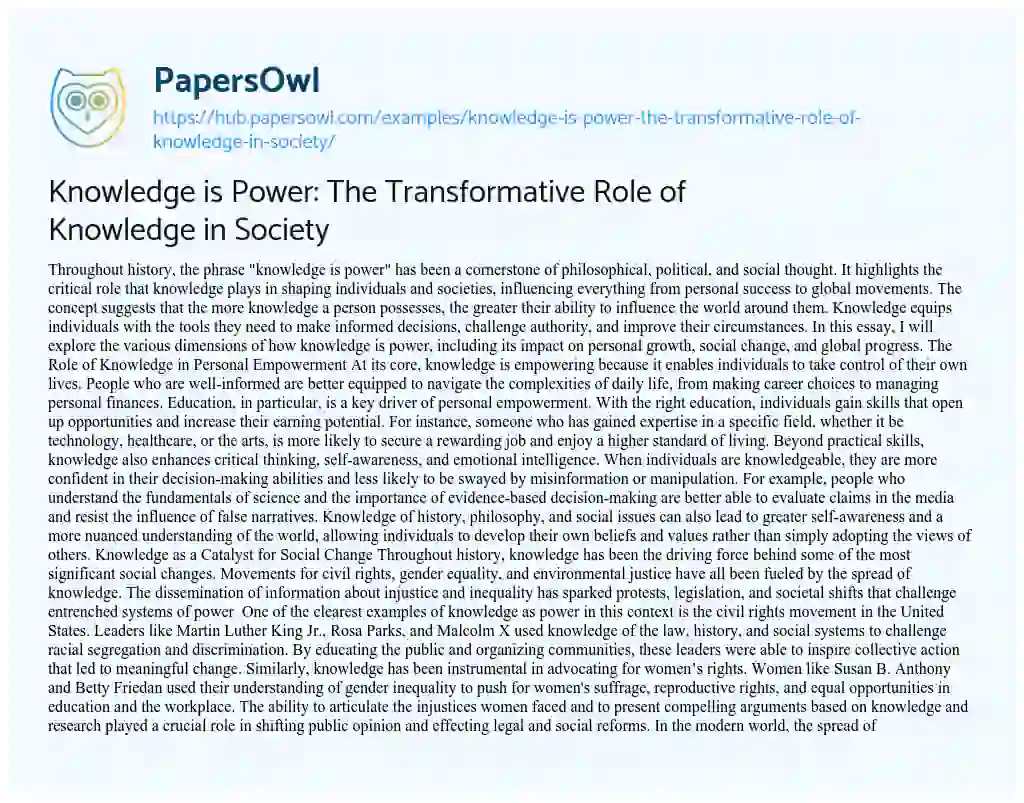 Knowledge is Power: The Transformative Role of Knowledge in Society. (2025, Jul 02). Retrieved from https://hub.papersowl.com/examples/knowledge-is-power-the-transformative-role-of-knowledge-in-society/