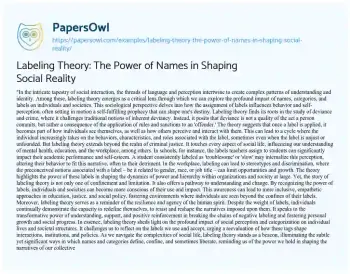 This essay delves into the profound implications of labeling theory in society, highlighting how labels, once assigned, can significantly influence an individual’s behavior and self-perception. It explores the origins of labeling theory in the realm of deviance and crime, illustrating how deviance is often a result of societal reaction rather than inherent behavior. The piece extends the application of labeling theory to various social contexts, including education and the workplace, demonstrating how labels can limit potential and reinforce stereotypes. However, it also acknowledges the potential for awareness and change, emphasizing the need for conscious use of labels and the human capacity to transcend and redefine imposed narratives. The essay calls for a reevaluation of societal perceptions and categorizations, underscoring the power of language in shaping individual identities and societal structures, ultimately advocating for a more empathetic and inclusive approach in understanding and interacting with one another. More free essay examples are accessible at PapersOwl about Theory.