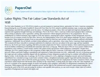 This essay is about the Fair Labor Standards Act of 1938 (FLSA) and its impact on Native American communities. It explores how the FLSA aimed to establish minimum wage and overtime pay standards but posed challenges for indigenous peoples due to conflicts with tribal laws and cultural practices. Despite initial exclusions and complexities regarding child labor, the FLSA marked progress in recognizing labor rights for Native Americans. Over time, amendments have expanded protections, yet disparities persist, highlighting the ongoing struggle for justice and equality in the workplace.