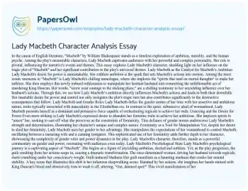 This essay will provide a character analysis of Lady Macbeth from Shakespeare’s “Macbeth.” It will explore her role in the play, her manipulative and ambitious traits, her psychological progression, and her ultimate downfall, reflecting on her impact on the play’s events. Moreover, at PapersOwl, there are additional free essay samples connected to Lady Macbeth.