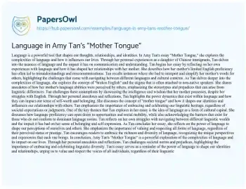 In conclusion, Amy Tan's "Mother Tongue" is a powerful exploration of the complexities of language and its impact on our lives. Through her personal anecdotes and reflections, Tan challenges societal norms and prejudices, highlighting the importance of embracing and celebrating linguistic diversity. Tan's essay serves as a reminder of the power of language to shape our identities and relationships, urging us to value and respect the voices of all individuals, regardless of their linguistic background.