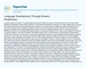 This engaging essay delves into the intriguing concept of Brown’s morphemes, a key tool in understanding the stages of language development in children. It paints a vivid picture of how Roger Brown’s groundbreaking research in the 1970s identified 14 crucial morphemes – those small but significant elements of language like ‘-s’ for plurals and ‘-ed’ for past tense – that children typically acquire in a certain order. The essay likens this process to climbing a ladder, with each rung representing a new stage in mastering language intricacies. It underscores the practical application of Brown’s findings, particularly in education and speech therapy, where these morphemes serve as benchmarks to assess a child’s linguistic progression. The piece also touches on the cognitive processes behind language learning, suggesting that children internalize and apply grammatical rules rather than merely imitating speech. Additionally, the essay acknowledges the individual variability in language development, influenced by environmental, cultural, and personal factors. Overall, the essay offers a fascinating glimpse into how children navigate the complex world of language, highlighting Brown’s morphemes as a crucial framework for understanding this remarkable journey. Moreover, at PapersOwl, there are additional free essay samples connected to Language.