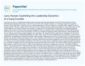 This essay delves into the life and legacy of Larry Hoover, known for founding and leading the Gangster Disciples, one of Chicago’s most formidable street gangs. It explores Hoover’s early life, tracing his journey from a youth in Chicago’s turbulent South Side to becoming a notorious gang leader. The essay examines the growth and organization of the Gangster Disciples under Hoover’s leadership, highlighting his efforts to structure the gang with a complex hierarchy and codes of conduct, and his later attempts to rebrand it with a focus on community empowerment and political activism. Hoover’s 1973 conviction for murder and subsequent life in prison, where he continued to lead the gang, is also discussed, underscoring his enduring influence. The piece navigates the contentious debate surrounding Hoover, considering him within the broader context of gang culture, systemic poverty, and racial inequality. It presents differing perspectives on Hoover’s impact, from those viewing him as a victim of his environment to others seeing him as a perpetuator of community harm. Concluding with reflections on Hoover’s multifaceted legacy, the essay provides a nuanced examination of the complex dynamics of gang leadership and its socio-political implications. At PapersOwl, you’ll also come across free essay samples that pertain to Leadership.