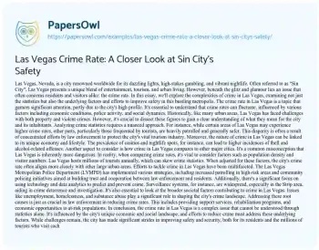 This essay takes an in-depth look at the crime rate in Las Vegas, moving beyond the city’s glitzy façade to examine the realities of safety in “Sin City.” It explores the multifaceted nature of crime in Las Vegas, acknowledging the fluctuating statistics and the factors influencing them, such as economic conditions, the impact of tourism, and the concentration of law enforcement efforts. The essay delves into the complexities of interpreting crime data, highlighting the importance of considering variables like population density and the influx of tourists. It also compares Las Vegas’ crime rate with other major cities, challenging common misconceptions about its safety. Additionally, the piece discusses the efforts made by the Las Vegas Metropolitan Police Department, including community policing and technological advancements, to mitigate crime. It underscores the significance of addressing broader societal issues like unemployment and substance abuse as part of comprehensive crime reduction strategies. Overall, the essay presents a nuanced perspective on Las Vegas’ crime rate, emphasizing the city’s ongoing endeavors to ensure safety for both residents and visitors. Moreover, at PapersOwl, there are additional free essay samples connected to Crime