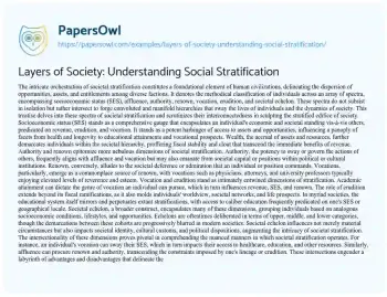 In summation, societal stratification constitutes a complex and multifaceted facet of human civilizations, sculpted across sundry dimensions such as SES, affluence, authority, renown, vocation, erudition, and societal echelon. These dimensions intersect in intricate fashions, birthing a tiered hierarchy that influences individuals' opportunities, resources, and life trajectories. Understanding the mechanisms and ramifications of societal stratification is imperative for redressing disparities and nurturing a more equitable society. By dissecting the interplay between disparate dimensions of stratification, we glean insights into the trials and prospects for societal mobility and transformation, underscoring the exigency for policies and methodologies that confront the root causes of inequality.