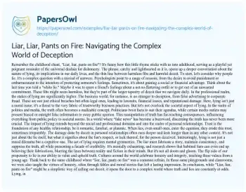 This insightful essay delves into the intriguing theme of deception, inspired by the childhood chant “Liar, Liar, Pants on Fire.” It explores the complexities of lying, examining why people lie and the various contexts in which deception occurs. The essay navigates through the psychological reasons behind lying, such as avoiding punishment or protecting feelings, and extends into the professional realm where deceit can have serious legal and ethical consequences. The discussion further highlights the impact of lying in politics and media, emphasizing the challenges in discerning truth in an era of ‘fake news.’ Moreover, the essay reflects on the personal ramifications of lying, underscoring how deceit can damage trust in relationships. It also touches upon the cognitive aspects of lying, pointing out the mental effort required to maintain falsehoods. Despite these challenges, the essay concludes with a hopeful perspective, recognizing the universal value of honesty and integrity taught from a young age. Overall, it presents a nuanced understanding of the role of lies in human behavior, balancing our tendency to deceive with our inherent appreciation for truth. PapersOwl showcases more free essays that are examples of Deception.