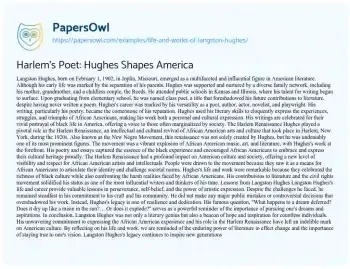 Harlem's Poet: Hughes Shapes America. (2021, Aug 04). Retrieved from https://hub.papersowl.com/examples/life-and-works-of-langston-hughes/