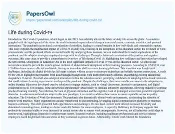 By analyzing these domains, we can understand the broader implications of the pandemic and the adaptive strategies employed to cope with its challenges. Through a balanced examination of the positive and negative outcomes, this essay aims to provide a comprehensive overview of life during Covid-19, highlighting how resilience and innovation have shaped the new normal.