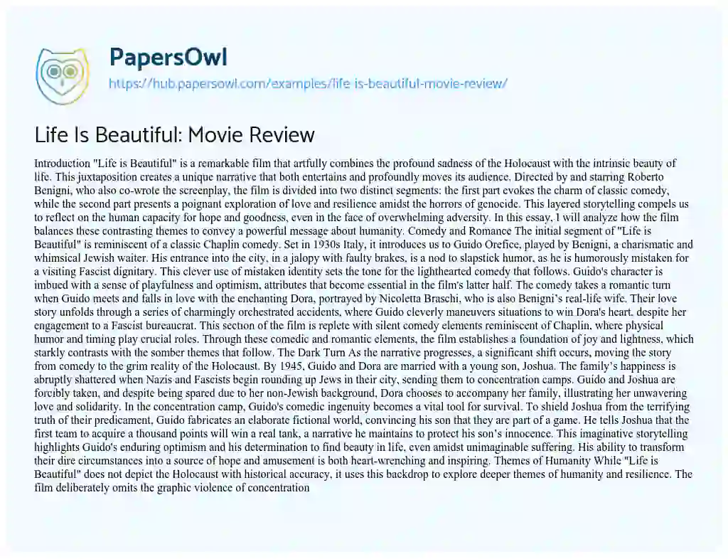 Life Is Beautiful: Movie Review. (2022, Apr 29). Retrieved from https://hub.papersowl.com/examples/life-is-beautiful-movie-review/