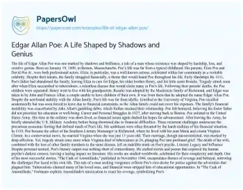 Edgar Allan Poe: A Life Shaped by Shadows and Genius. (2021, Mar 27). Retrieved from https://hub.papersowl.com/examples/life-of-edgar-allen-poe/