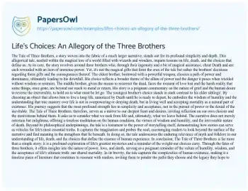 This essay about the allegorical tale of three brothers examines the profound life lessons embedded within their story. It analyzes the choices each brother makes after tricking Death and receiving gifts of immense power. The narrative explores themes of power, loss, and humility, illustrating how these choices reflect broader human experiences and desires. The eldest brother’s downfall warns against the allure of power, the middle brother’s sorrow speaks to the pain of irrevocable loss, and the youngest’s wise choice highlights the virtue of living a life in acceptance of death’s inevitability. Through their stories, the essay reveals insights into the human condition, emphasizing the importance of wisdom, humility, and the acceptance of mortality. It also celebrates the power of storytelling to convey timeless truths about life, death, and the choices that define us, showcasing the tale as a rich source of reflection on the essence of human experience.