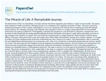 This essay takes us on a journey through the miracle of life, from the magical moment of conception to the breathtaking event of birth. It begins with the fusion of a sperm and an egg, painting a vivid picture of the start of human creation. The narrative then delves into the embryonic stage, where the foundations of our physical being are laid, highlighting the intricacy and wonder of this process. As the fetus develops, we see the transformation from a cluster of cells into a recognizable human form, a process filled with anticipation and emotional bonding, especially during ultrasound glimpses. The essay reaches its climax with the act of birth, a moment that symbolizes a dramatic shift from a protected uterine life to the outside world. This piece beautifully encapsulates the awe-inspiring biological journey of human development, infused with a sense of wonder and emotion. It portrays the process of human creation as not just a biological phenomenon but as a wondrous and deeply moving journey, showcasing the miracle of life as the most extraordinary show on Earth. More free essay examples are accessible at PapersOwl about Life