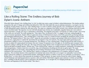 Like a Rolling Stone: The Endless Journey of Bob Dylan's Iconic Anthem. (2024, Jan 26). Retrieved from https://hub.papersowl.com/examples/like-a-rolling-stone-the-endless-journey-of-bob-dylans-iconic-anthem/