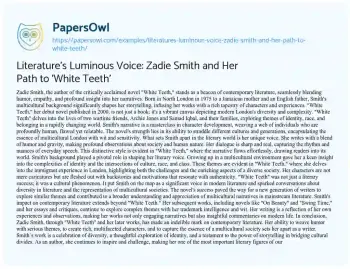 Literature's Luminous Voice: Zadie Smith and Her Path to 'White Teeth'. (2023, Dec 28). Retrieved from https://hub.papersowl.com/examples/literatures-luminous-voice-zadie-smith-and-her-path-to-white-teeth/