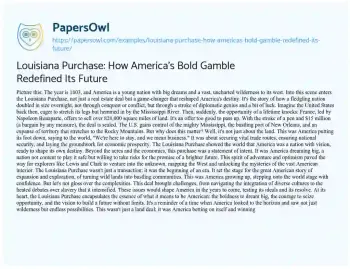 This essay about the Louisiana Purchase discusses its monumental impact on the United States’ expansion, economy, and identity. In 1803, America doubled its size through a $15 million deal with France, acquiring over 828,000 square miles of territory. This strategic move secured vital trade routes and laid the groundwork for the nation’s future prosperity. The purchase demonstrated America’s vision and diplomatic prowess, setting a precedent for future expansion and shaping the country’s destiny. It also brought challenges, including cultural integration and debates over slavery, which would influence the nation’s development. Overall, the essay portrays the Louisiana Purchase as a pivotal moment in American history, highlighting its role in transforming the U.S. into a continental power with limitless potential. PapersOwl offers a variety of free essay examples on the topic of Louisiana Purchase.