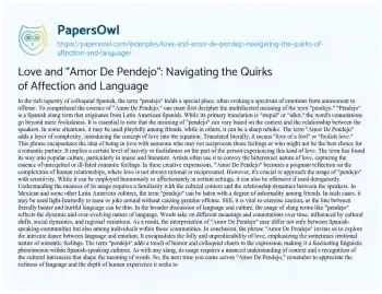 “Love and Amor De Pendejo” invites readers to appreciate the dynamic nature of language, where words evolve, adapting to cultural shifts and regional nuances. In this brief exploration, the interplay between language and emotion unfolds, shedding light on the unpredictability of romantic feelings. So, immerse yourself in the charm of colloquial expressions, as this journey unveils the rich tapestry of love and linguistic quirks. PapersOwl showcases more free essays that are examples of Love.