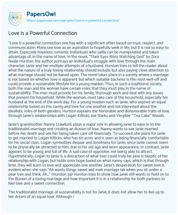 "Love is a powerful connection one has with a significant other based on trust, respect, and communication. Many see love as an aspiration to hopefully seek in life, but it is not so easy to attain. Especially hopeless romantic individuals who sadly can be manipulated and taken advantage of, in the name of love. In the novel, “Their Eyes Were Watching God” by Zora Neale Hurston, the author portrays an individual’s struggle with love through the main character, Janie and her multiple attempts of a husband.
