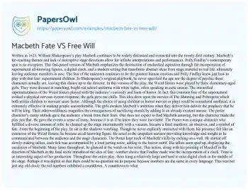 Explore the tension between fate and free will in Shakespeare’s ‘Macbeth’. Discuss how the prophecy of the Weird Sisters influences Macbeth’s actions and the play’s exploration of predestination versus personal choice. Analyze whether Macbeth is a victim of fate or the architect of his own downfall. At PapersOwl, you’ll also come across free essay samples that pertain to Free Will.