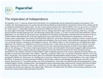 The Imperative of Independence. (2019, Feb 09). Retrieved from https://hub.papersowl.com/examples/main-reasons-of-seperation-from-great-britain/