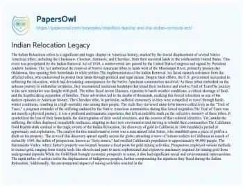 Indian Relocation Legacy. (2021, Oct 15). Retrieved from https://hub.papersowl.com/examples/manifest-destiny-and-the-indian-removal-act/