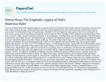 Mansa Musa: The Enigmatic Legacy of Mali's Illustrious Ruler. (2024, May 28). Retrieved from https://hub.papersowl.com/examples/mansa-musa-the-enigmatic-legacy-of-malis-illustrious-ruler/