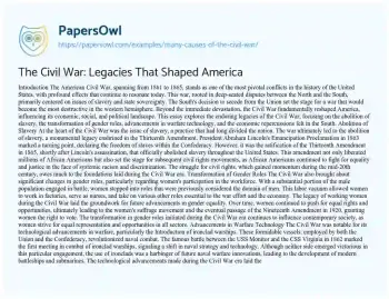 This essay explores the enduring legacies of the Civil War, focusing on the abolition of slavery, the transformation of gender roles, advancements in warfare technology, and the economic repercussions felt in the South.