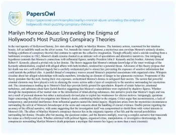 Delve into the enigmatic circumstances surrounding Marilyn Monroe’s untimely death for an insightful essay. Explore the conspiracy theories that challenge the official narrative of suicide due to a barbiturate overdose in 1962. Unravel the web of intrigue surrounding Monroe’s connections with influential figures like President John F. Kennedy and alleged ties to organized crime. Examine the hypothesis that her demise was a result of manipulation and exploitation of her vulnerabilities. Scrutinize the lingering questions about the investigation, pointing to inconsistencies and potential interference. Through a narrative rich in complexity, the essay aims to shed light on the enduring mystery that surrounds the iconic Hollywood star, transcending her cinematic legacy and inviting readers to contemplate the various facets of her life and death. At PapersOwl, you’ll also come across free essay samples that pertain to Abuse.