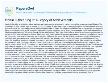 Despite encountering vehement opposition and personal sacrifices, King remained unwavering in his quest for equity and parity until his assassination on April 4, 1968. He bequeathed a legacy of achievements that persistently mold the contemporary struggle for civil rights. His endeavors propelled the cause of equity for African Americans and underscored the significance of nonviolent opposition in contesting injustice. King's accomplishments endure as a testimonial to the transformative potency of fortitude and benevolence, reminding us that substantive metamorphosis can emanate from resolute conviction in a brighter world.