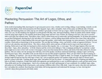 This essay is about the three core elements of persuasion identified by Aristotle: logos, ethos, and pathos. Logos appeals to logic and reason through data and evidence, ethos builds credibility and trust in the speaker, and pathos targets emotions to connect with the audience. The essay explains how these elements work individually and in combination to enhance persuasive communication. It also discusses the importance of understanding these rhetorical strategies to both construct effective arguments and critically evaluate others’ messages. Mastery of logos, ethos, and pathos is essential for effective communication in various contexts, from academic writing to everyday interactions.