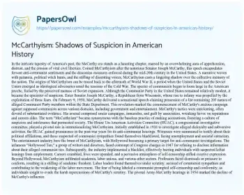 This essay about on the McCarthy era in American history unveils a haunting chapter characterized by an atmosphere of fear, distrust, and the erosion of civil liberties. Termed McCarthyism after Senator Joseph McCarthy, it examines the fervent anti-communist sentiments and stringent measures of the mid-20th century. The narrative reveals McCarthy’s ruthless tactics, including smear campaigns and guilt by association, fostering a culture of suspicion. The House Un-American Activities Committee played a crucial role in institutionalizing McCarthyism, resulting in blacklisting and societal ostracism. The essay into McCarthyism’s impact on Hollywood, academia, and labor unions, outlining the significant consequences of baseless accusations. The pivotal Army-McCarthy hearings in 1954 marked the waning of McCarthy’s influence, and the lasting legacy serves as a cautionary tale about the delicate balance between national security and individual liberties. In summary, the essay highlights McCarthyism as a somber period, leaving an indelible mark on the nation’s conscience and emphasizing the fragility of democratic values. At PapersOwl, you’ll also come across free essay samples that pertain to History.