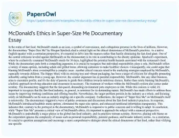 McDonald's Ethics in Super-Size Me Documentary Essay. (2023, Dec 22). Retrieved from https://hub.papersowl.com/examples/mcdonalds-ethics-in-super-size-me-documentary-essay/