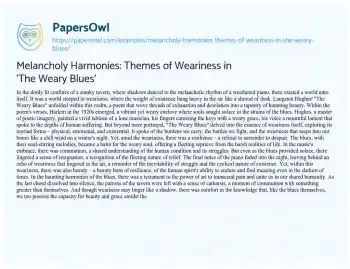 This essay about Langston Hughes’ “The Weary Blues” explores the themes of weariness and resilience depicted in the poem. Set in a smoky tavern in Harlem during the 1920s, the poem portrays a world burdened by the weight of existence yet finding solace in the melancholic melodies of the blues. Through vivid imagery, Hughes captures the essence of weariness in its various forms – physical, emotional, and existential – while also highlighting the resilience of the human spirit. Despite the fleeting nature of relief, there is a beauty found in the haunting harmonies of the blues, serving as a testament to the power of art to transcend pain and unite us in our shared humanity.