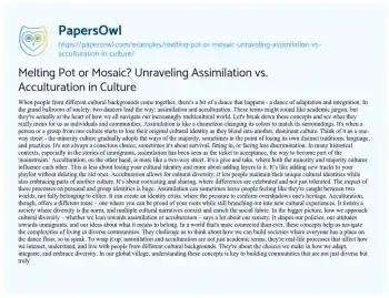 Melting Pot or Mosaic? Unraveling Assimilation vs. Acculturation in Culture. (2023, Dec 01). Retrieved from https://hub.papersowl.com/examples/melting-pot-or-mosaic-unraveling-assimilation-vs-acculturation-in-culture/