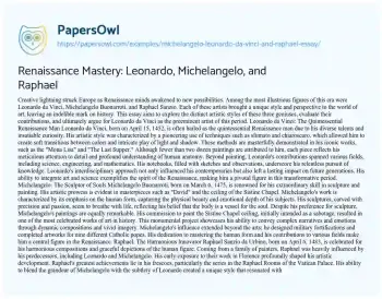 This essay will provide an overview of the works and contributions of Renaissance masters Michelangelo, Leonardo da Vinci, and Raphael. It will discuss their most famous works, their unique styles, and their impact on the art world. The piece will highlight the significance of their contributions during the Renaissance era. At PapersOwl, you’ll also come across free essay samples that pertain to Leonardo Da Vinci.