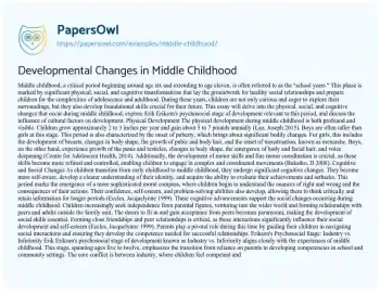 This essay will examine the developmental stage of middle childhood, typically ranging from ages 6 to 12. It will cover the physical, cognitive, social, and emotional development characteristics of this stage, including challenges and milestones commonly experienced during these formative years. At PapersOwl too, you can discover numerous free essay illustrations related to Adolescence.
