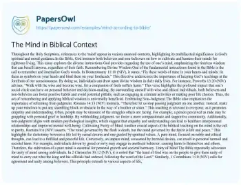 This essay will delve into the biblical perspective on the human mind. It will examine scriptural references to the mind, its moral and spiritual implications, and how these teachings relate to contemporary understandings of psychology. At PapersOwl too, you can discover numerous free essay illustrations related to Bible.