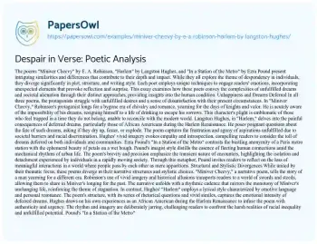 A. Robinson, "Harlem" by Langston Hughes, and "In a Station of the Metro" by Ezra Pound present intriguing similarities and differences that contribute to their depth and impact. While they all explore the theme of despondency in individuals, they diverge significantly in plot, structure, and writing style. Each poet employs unique techniques to engage readers' emotions, incorporating unexpected elements that provoke reflection and surprise. This essay examines how these poets convey the complexities of unfulfilled dreams and societal alienation through their distinct approaches, providing insights into the human condition.