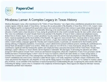 Mirabeau Lamar: A Complex Legacy in Texas History. (2024, Feb 20). Retrieved from https://hub.papersowl.com/examples/mirabeau-lamar-a-complex-legacy-in-texas-history/
