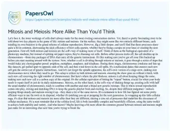 This essay about the similarities between mitosis and meiosis reveals the underlying commonalities of these two crucial cellular processes. Both are methods of cell division, integral for growth, repair, and reproduction, involving stages like prophase, metaphase, anaphase, and telophase, and relying on the spindle apparatus for chromosome movement. The narrative highlights that despite their distinct roles—with mitosis responsible for producing identical cells for repair and growth, and meiosis for generating genetically unique gametes—their fundamental steps and mechanisms are remarkably similar. This shared framework underscores the efficiency of cellular operations, whether in maintaining the organism’s integrity or ensuring genetic diversity through sexual reproduction. The essay portrays these processes not just as biological functions but as intricate dances of genetic material, showcasing the cell’s ability to adapt and utilize a core set of tools for both stability and change.