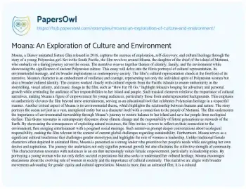 Moana, a Disney animated feature film released in 2016, captures the essence of exploration, self-discovery, and cultural heritage through the story of a young Polynesian girl. Set in the South Pacific, the film revolves around Moana, the daughter of the chief of the island of Motunui, who embarks on a daring journey across the ocean. The narrative weaves together themes of identity, family, and the environment while showcasing the significance of ancient Polynesian culture. This essay will delve into the film's portrayal of cultural representation, its environmental message, and its broader implications in contemporary society.